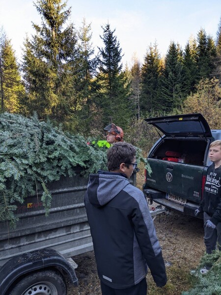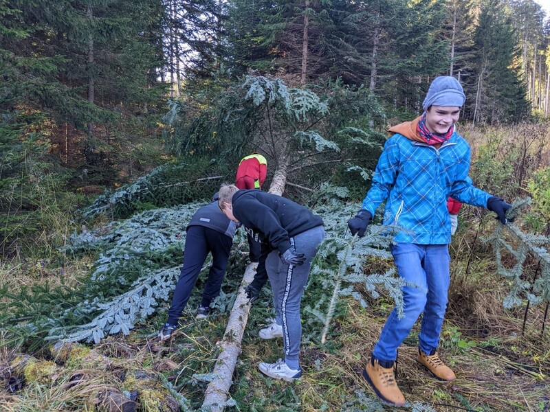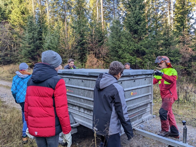 Dann ging es wieder zurück in die Schule, dort angekommen, luden die Schüler:innen der 9A und der 9C Klasse die Tannenäste für unsere Adventkranzwerkstatt ab.