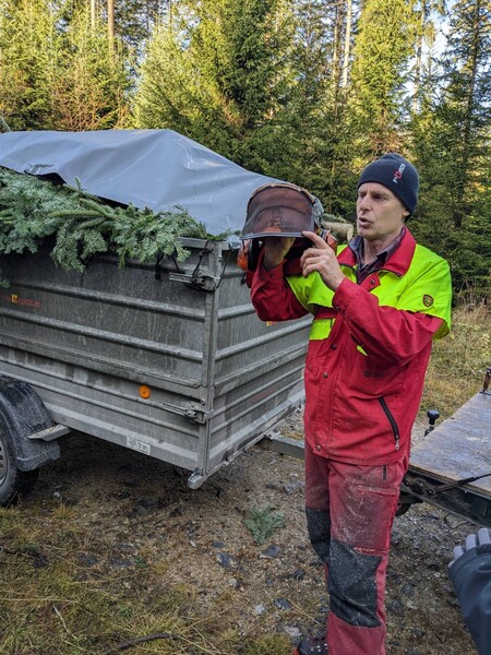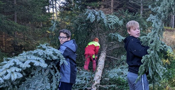 Mit Sicherheitsabstand von zwei Baumlängen fällte Herr Kellner den Baum mit seiner Motorsäge. „Baum fällt“ - das war sehr aufregend für uns! Danach trennte er mit seiner Motorsäge noch die großen Äste ab und die Spitze wird zu unserem Schulchristbaum!