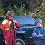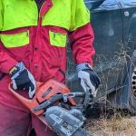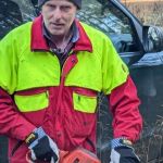 Herr Kellner erklärte uns die Geräte und die Sicherheitskleidung, die er beim Fällen brauchte – Motorsäge, Keile, Forsthelm, Schnittschutzhose und einiges mehr.